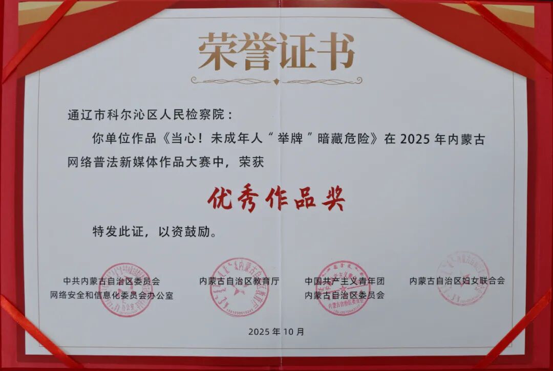 近日,在自治区党委网信办、自治区教育厅、自治区团委、自治区妇联联合举办的2025年内蒙古网络普法新媒体作品大赛活动中,科尔沁区检察院普法视频《当心!未成年人“举牌”暗藏危险》获视频类优秀作品奖。