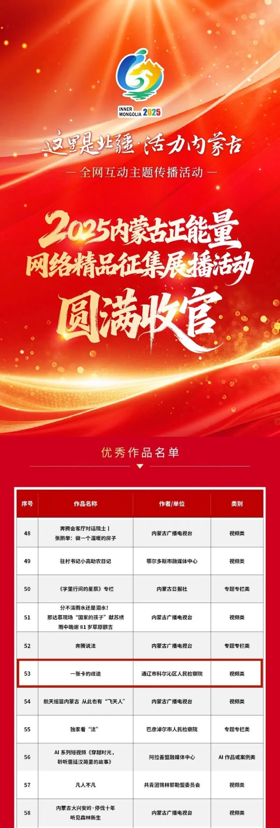 近日,由内蒙古自治区党委网信办主办的 “这里是北疆 活力内蒙古” 2025 内蒙古正能量网络精品征集展播活动圆满落幕。科尔沁区检察院原创视频《一张卡的歧途》凭借鲜明的检察特色、生动的普法表达,在6000余件作品中脱颖而出,荣获 “优秀作品” 称号!